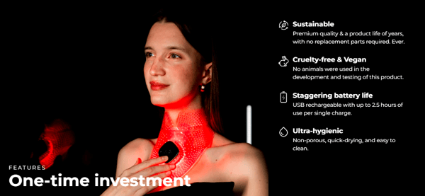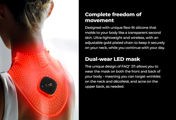 With 8 LED colors, including near-infrared. Designed to perfectly fit your neck & décolleté for even light coverage. This ultra-lightweight and wireless full-spectrum LED mask helps reduce wrinkles and repairs sun damage as you walk around and get on with your day.